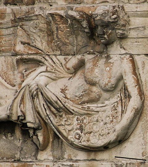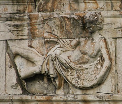 - Mythische Figur: fliegender jugendlicher Windgott Zephyros, nackt bis auf Mantel um die Hüften, im Mantelbausch Blüten. Namensbeischrift in der Gebälkzone oberhalb des Reliefs.