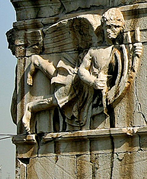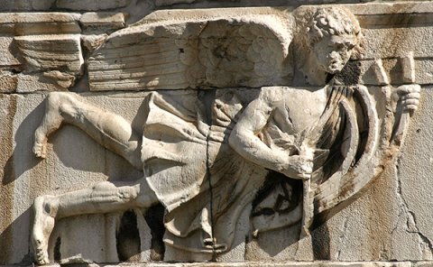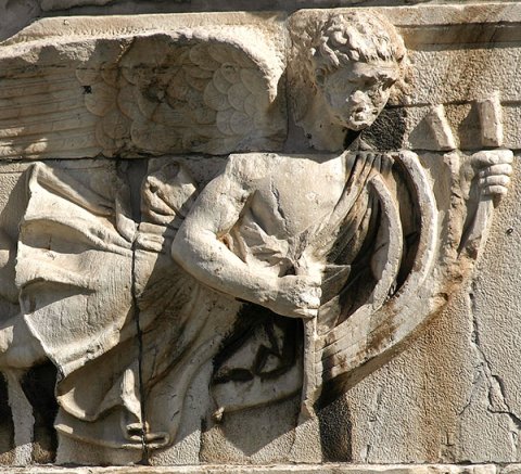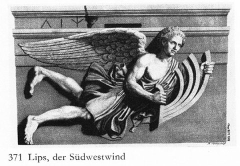 - Mythische Figur: fliegender jugendlicher Windgott Lips in kurzem Chiton und Mantel. In beiden Händen Verzierung eines Schiffhecks. Namensbeischrift in der Gebälkzone oberhalb des Reliefs.