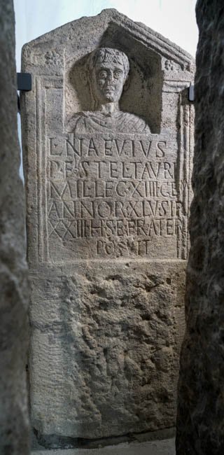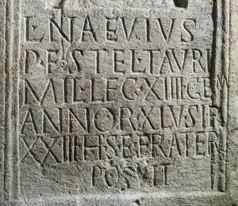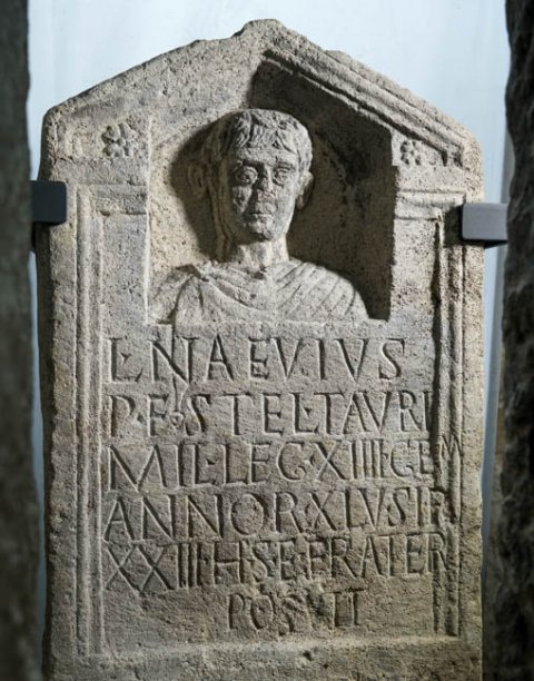 - L(ucius) Naevius / P(ubli) f(ilius) Stel(latina) Tauri(nis) / mil(es) leg(ionis) XIIII Gem(inae) / annor(um) XLV s(t)ip(endiorum) / XXIII h(ic) s(itus) e(st) frater / posuit