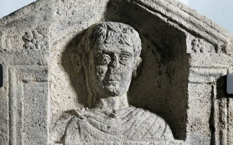 - Gerahmtes Schriftfeld und darüber gerahmter Giebel. Eine ungerahmte Porträtnische mit Giebel ist in Schrift- und Giebelfeld eingetieft. Darin Büste eines Mannes in Tunica und Sagum mit Bügelfibel. In den seitlichen Giebelecken je eine Rosette.