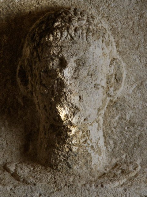 Oben halbrunder Abschluss, in eingetiefter Bogennische Büste eines Mannes mit kurzen Locken, Stirnfalten.