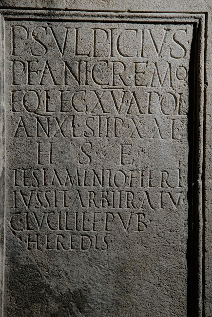 - P(ublius) Sulpicius / P(ubli) f(ilius) Ani(ensi) Cremo(na) / eq(ues) leg(ionis) XV Apol(linaris) / an(norum) XL stip(endiorum) XXI / h(ic) s(itus) e(st) / testamento fieri / iussit arbitratu / C(ai) Lucili L(uci) f(ilii) Pub(lilia) / heredis