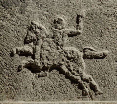 Im Sockelbild galoppierender Reiter (Soldat). Waffen: Schild u. Lanze. - Inschrift