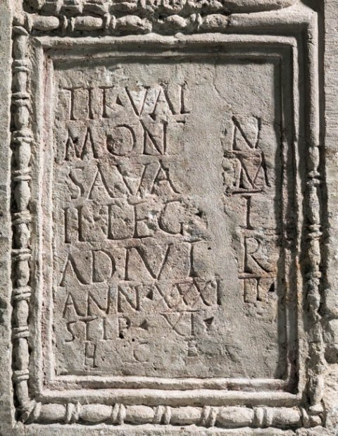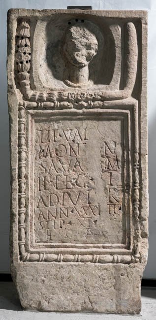 - Tit(us) Val(erius) C[la(udia)] / Montan(us) / Savar[ia] m/il(es) leg(ionis) I Adiut(ricis) / ann(orum) XXXI[I]II / stip(endiorum) XI / h(ic) c(onditus) e(st)