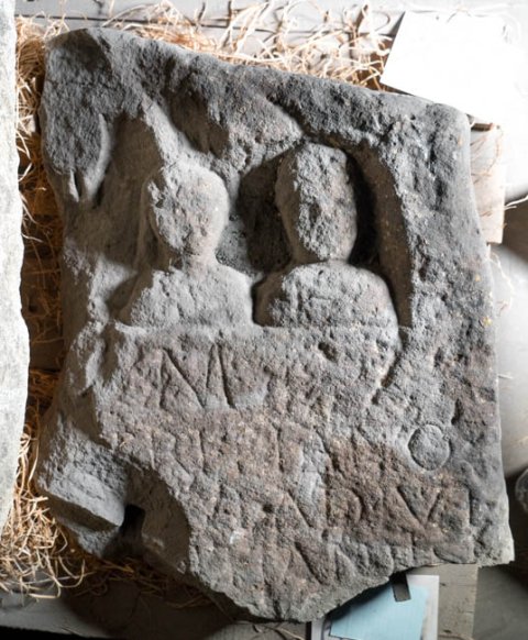 - Rest eines Giebels mit Adler (?), rechts davon Büsten einer Frau mit Schleier und eines Mannes.