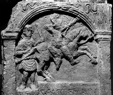 - Profilierter Bogen auf glatten Pilastern, die Bildnische und Schriftfeld flankieren. Auf den Pilasterkapitellen Akanthusakrotere, über dem Bogen Tänien. Im Bogenfeld galoppierender Reiter (Soldat, Bogenschütze) nach rechts. Er trägt Helm, Panzer (?) und Hosen, Dolch am Gürtel, und spannt den Bogen, in der Linken Pfeile, vom Sattel hängt ein Köcher. Hinter dem Pferd stehender Mann (Calo ?) in kurzer Tunica und Stiefeln, in der Linken ein Bündel Pfeile, in der Rechten ein Pfeil.