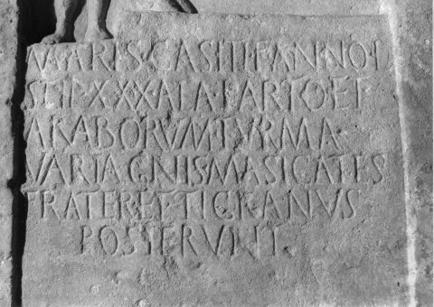 - Maris Casiti f(ilius) anno(rum) L / stip(endiorum) XXX ala Part(h)o(rum) et / Araborum turma / Variagnis Masicates / frater et Tigranus / posierunt(!)