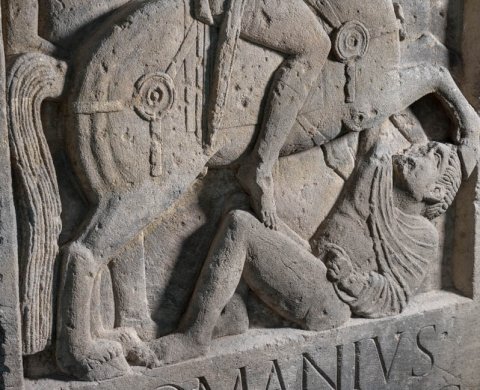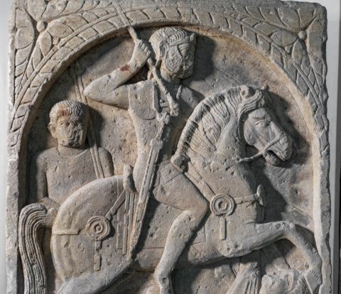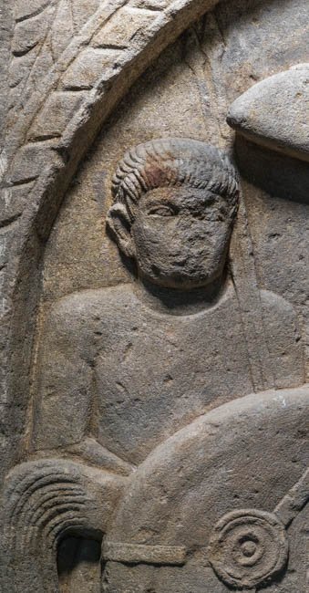 - Über dem rahmenlosen Schriftfeld Bogennische, oben mit tordiertem Band gerahmt, in den Zwickeln Blattrosetten. Über einen Gefallenen mit Schild und erhobener Rechter hinweg galoppierender Reiter (Soldat) in Hosen und Sandalen. Waffen: Helm, Panzer, Gürtel mit Langschwert. In der erhobenen Rechten Lanze. Hinter dem Pferd stehender Calo mit zwei Lanzen.