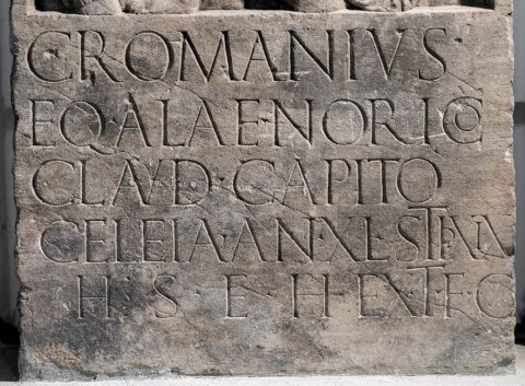- C(aius) Romanius / eq(ues) alae Norico(rum) / Claud(ia) Capito / Celeia an(norum) XL stip(endiorum) XIX / h(ic) s(itus) e(st) h(eres) ex t(estamento) f(aciendum) c(uravit)
