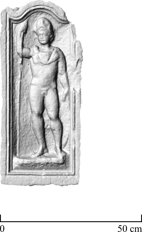 - Mythische Figur (Mars, Heros ?). In Bogennische auf flachem Podest nackter Jüngling mit Mantel über den Schultern und Waffen: Helm, in der Rechten Lanze, die Linke auf dem Schild.