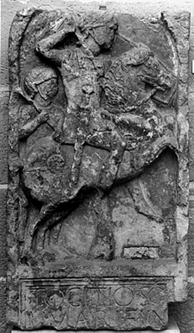 - In Bogennische Reiter (Soldat). Waffen: Helm und Panzer, in der erhobenen Rechten Lanze, an der rechten Seite Langschwert, hinter dem Pferdekopf Schild. Unter dem Pferdekörper Baumstammstütze. Hinter dem Pferd stehender Calo in Helm und kurzer Tunica, in der Rechten Lanze. Schriftfeld gerahmt.