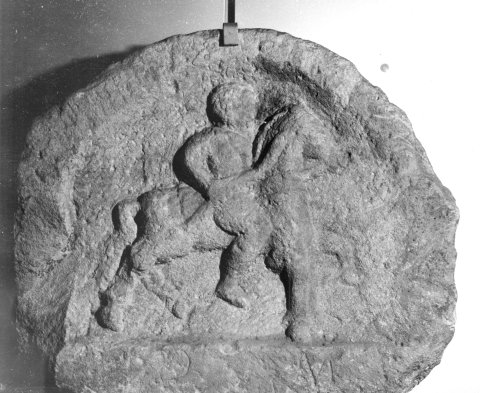 - In Bogennische Reiter (Soldat) in kurzer Tunica und wehendem Sagum nach rechts. In der rechten Hand Lanze.