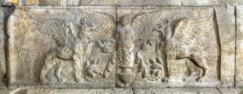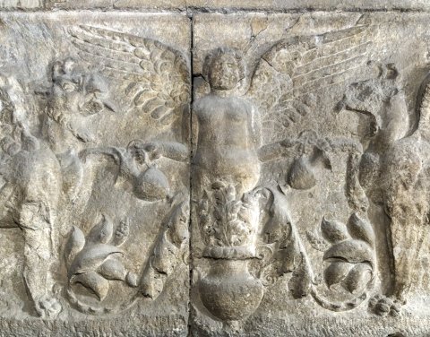 - Mythische Figuren: in der Mitte Krater mit Volutenhenkeln, darüber Akanthuskelch mit Ranken, aus dem der nackte Körper eines geflügelten Knaben auftaucht, der in beiden Händen je eine Henkelkanne (Oinochoe) hält, Rechts und links je ein stehender Greif mit erhobener Vorderpranke.