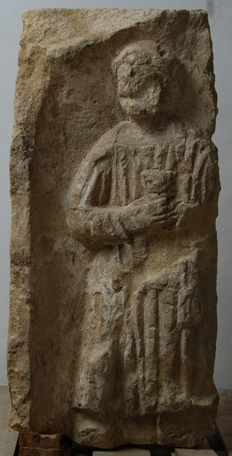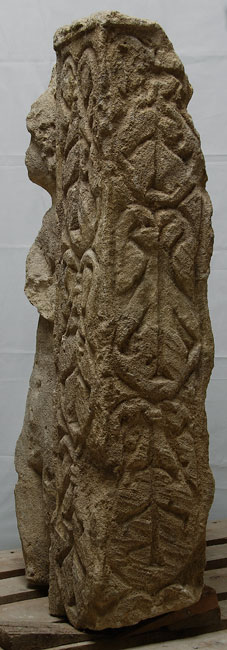 - Linke Seitenwange. Auf der Außenseite Reste einer Mänade, auf der Stirnseite vegetabiles Ornament, auf der Innenseite stehender Diener, in der Rechten Gefäß.