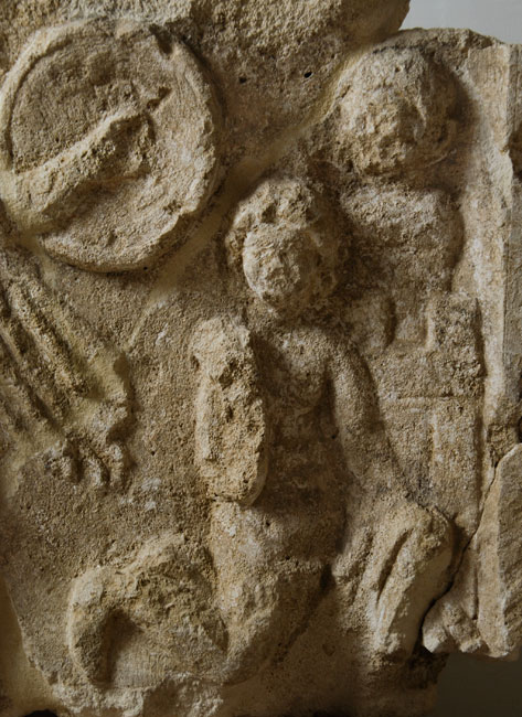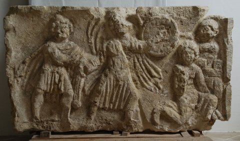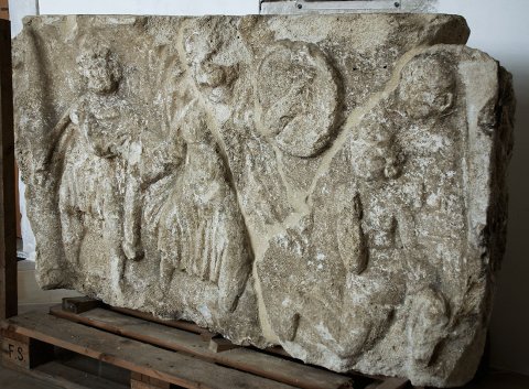 - aus mehreren Fragmenten zusammengesetzt, stark bestoßen, Unterkante verbr.