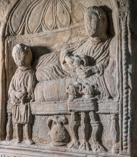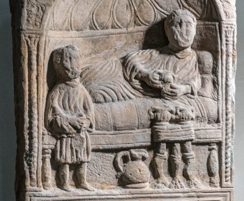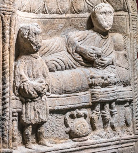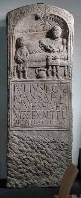 - Totenmahl: in Nische mit Muschelkonche auf einer Kline gelagerter Mann in Ärmeltunica, in der Rechten Becher. Links stehender Diener mit Kanne. Vor der Kline dreibeiniger Tisch mit Gefäßen, daneben große Kanne. Über der Muschel flacher Bogen mit Ranken, getragen von dünnen tordierten Säulen. Schriftfeld gerahmt.