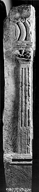 - Eingeschriebener Giebel, auf den Giebelschrägen Fries von gegenständigen S-Haken, auf den Ecken Palmettenakrotere. Im Giebelfeld Waffen (Rundschild und zwei Lanzen zwischen S-Voluten). Giebelzone liegt auf kannelierten Eckpilastern mit korinthischen Kapitellen, zwischen diesen Fries mit Efeuranken. Zwischen den Pilastern gerahmtes Schriftfeld, unter diesem profilierte Leiste auf drei toskanischen Säulen.