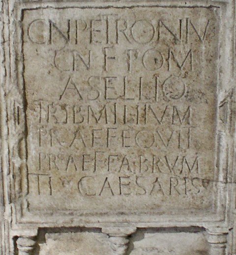 - Cn(aeus) Petronius / Cn(aei) f(ilius) Pom(ptina) / Asellio / trib(unus) militum / praef(ectus) equit(um) / praef(ectus) fabrum / Ti(beri) Caesaris
