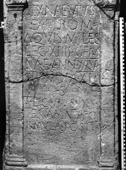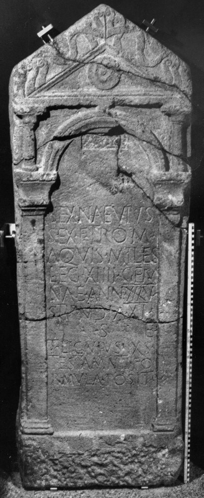 - Sex(tus) Naevius / Sex(ti) f(ilius) Trom(entina) / Aquis miles / leg(ionis) XIIII Gem(i)/nae ann(orum) XXXV / stip(e)ndia XI / h(ic) s(itus) e(st) / T(itus) Lic(i)nius ex{s} / testamenti fo/rmula pos(u)it