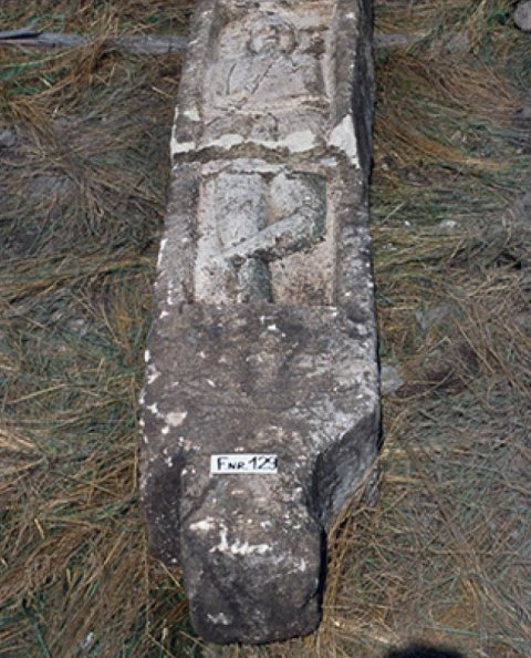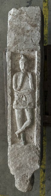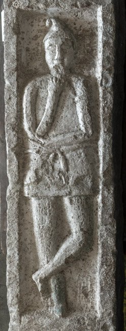 Mythische Figur: rahmenlose rechteckige Stele mit Einlasszapfen. Im eingetieften Bildfeld Attisfigur mit überkreuzten Beinen, rechte Hand unter dem Kinn. Phrygische Mütze, kurzes Gewand, Hosen.