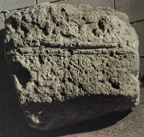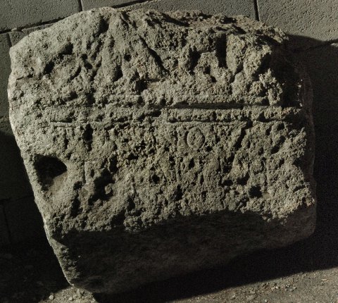 - über dem gerahmten Schriftfeld Reliefreste (Blattornament ?)