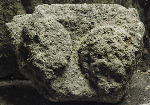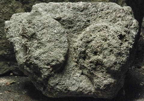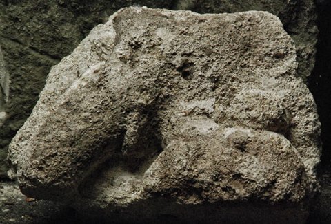 - Beidseitig reliefierter Stein. Auf einer Seite zwei runde Umrisse (Kopf einer Dienerin mit Spiegel ?). Auf der anderen Seite Reste eines älteren Reliefs ?