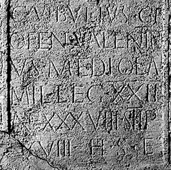 - C(aius) Vibulius / C(ai) f(ilius) / O(u)fent(ina) Valentin/us Mediola(no) / mil(es) leg(ionis) XXII / an(norum) XXXVIII stip(endiorum) / XVIII h(ic) s(itus) e(st)