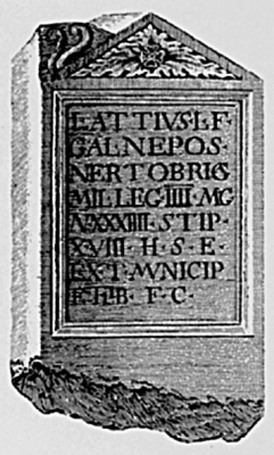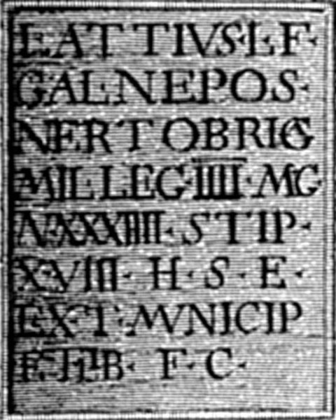 - L(ucius) Attius L(uci) f(ilius) / Gal(eria) Nepos / Nertobriga / mil(es) leg(ionis) IIII Mac(edonicae) / an(norum) XXXIIII stip(endiorum) / XVIII h(ic) s(itus) e(st) / ex t(estamento) municip(es) / et lib(erti) f(aciendum) c(uraverunt)