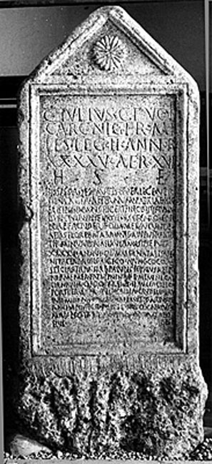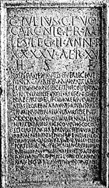 - C(aius) Iulius C(ai) f(ilius) Vol(tinia) / Carc(asone) Niger mi/les leg(ionis) II annor(um) / XXXXV aer(orum) XVII / h(ic) s(itus) e(st) / hospes ades paucis et perle[g]e ver/sibus acta aeternum patriae hic / erit ipsa domus hic erit inclusus tumu/lo hic Iulius ipse hi[c] cinis e[x] caro cor/pore factus erit cum me[a] iucunde / aetas florebat ab annis advenit fatis / t[e]rminus ips[e m]eis ultimus ipse [f]uit / XXXXV annus cum mihi fatalis ve/nit acerba di[es] hi[c] ego nunc cogor / Sty[g]ias transire paludes sedibus aeter/nis me mea fat[a] tenent me memini Gal/lia natum caroq(ue) [p]are[nt]e et milis collo / fortiter arma [t]uli Gallia crudelis tri/buit mihi [fu]nu[s et ignem et] cu[l]tos artus ter/ra cinis[qu(e) premunt? ---]to [g]natus / miles le[g(ionis)] II [---]p[---]at heris (!) / eius est