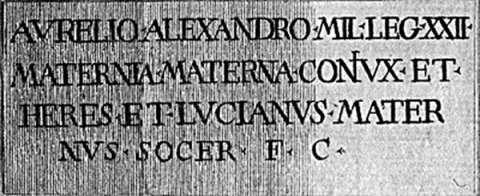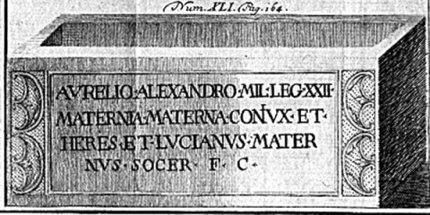 - Aurelio Alexandro mil(iti) leg(ionis) XXII / Maternia Materna coniux et / heres et Lucanius Mater/nus socer f(aciendum) c(uraverunt)