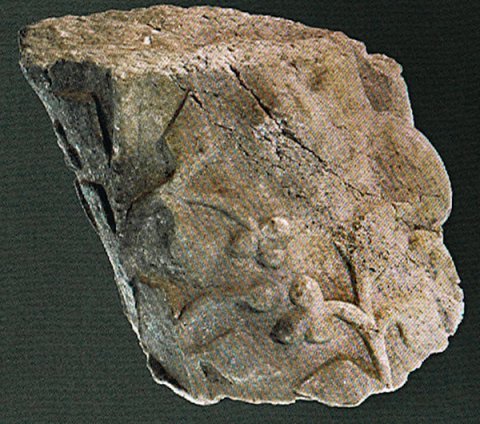 - Fragment einer Baumstamm-Stütze, von Efeuranken umwunden, auf einer Seite Schulterbüste mit Enden von über den Hals herab hängenden Tänien.
