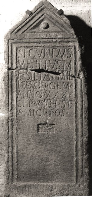 - Secundus / Metilius M(arci) / f(ilius) St(e)l(latina) Tau(rinis) mil(es) / leg(ionis) XIV Gem(inae) / anno(rum) XXX / stip(endiorum) VII h(ic) s(itus) e(st) / a{e}mici pos(uerunt)