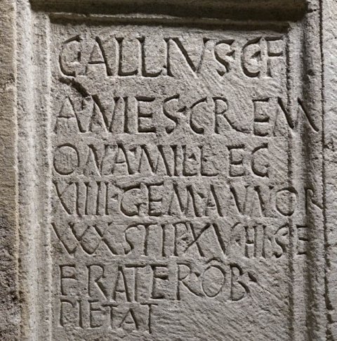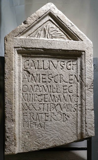 - C(aius) Allius C(ai) f(ilius) / Anie(n)s(i) Crem/ona mil(es) leg(ionis) / XIIII Gem(inae) annor(um) / XXX stip(endiorum) XV hi(c) s(itus) e(st) / frater ob / pietat(em)
