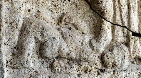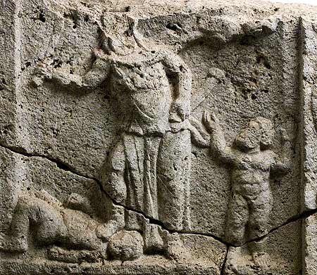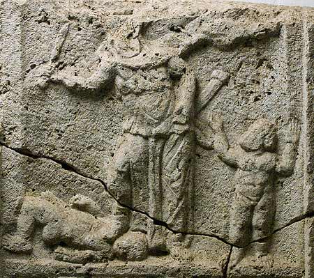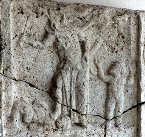 - Mythos : in Rechteckfeld zwischen Resten von zwei Seitenfeldern Medea beim Kindermord: Sie tritt auf die Leiche eines Kindes, das Schwert in der Rechten, die Schwertscheide in der Linken, rechts steht das zweite Kind mit erhobenen Armen. Unten Leiste mit Spiralranken, rechts Bildfeld mit Reliefrest (Efeuranke).