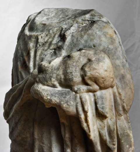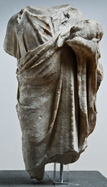 - Statue eines stehenden Knaben in kurzem Chiton und Mantel, in der linken Armbeuge Hase