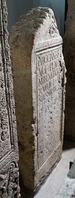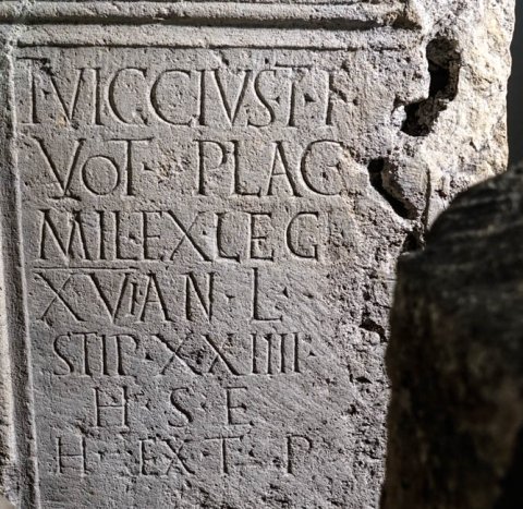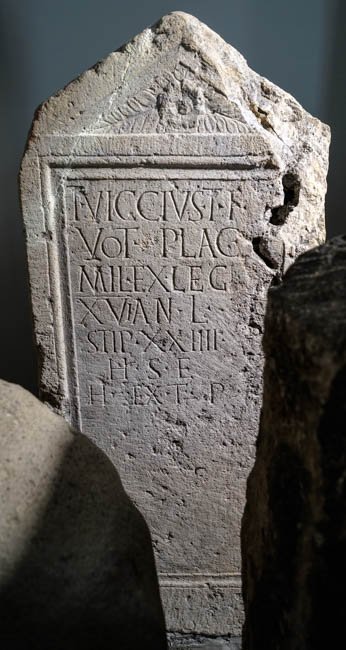 - T(itus) Viccius T(iti) f(ilius) / Vot(uria) Plac(entia) / mil(es) ex leg(ione) / XVI an(norum) L / stip(endiorum) XXIIII / h(ic) s(itus) e(st) / h(eres) ex t(estamento) p(osuit)
