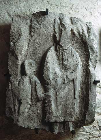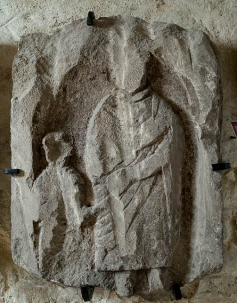 - Familie : in Bogennische stehende Ganzfiguren, rechts Mann in halblanger Tunica, Mantel und Halstuch, links Kind (Knabe ?).