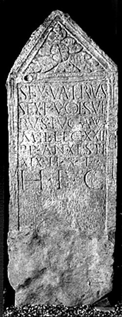 - Sex(tus) Valerius / Sex(ti) f(ilius) Vol(tinia) S(e)ve/rus Luc(o) Aug(usti) / mil(es) leg(ionis) XXII / Pr(imigeniae) an(norum) XL sti(pendiorum) / XIX h(ic) s(itus) e(st) / h(eres) f(aciendum) c(uravit)