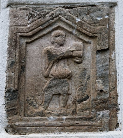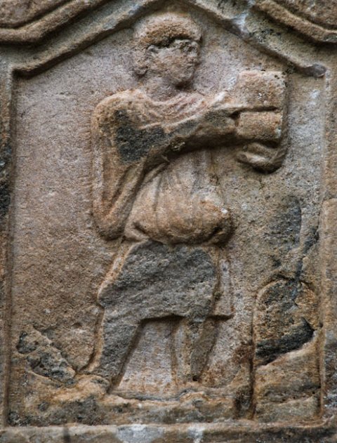 - Diener (Librarius - Scriba): gerahmtes Bildfeld mit Giebel. Nach rechts gewandter Mann in kurzer Tunica, schreibt mit Stilus in Diptychon, vor ihm hoher. oben abgerundeter Behälter.