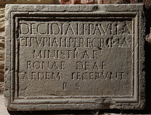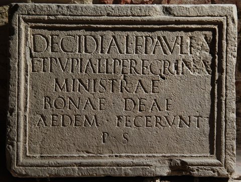 - Decidia L(uci) f(ilia) Paulla / et Pupia L(uci) l(iberta) Peregrina / ministrae / B(onae) D(eae) / aedem fecerunt / p(ecunia) s(ua)