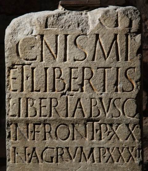 - [-]IL[--]IRII / Cnismi /et / libertis / libertabusq(ue) / in front(e) p(edes) XX / in agrum p(edes) XXXII