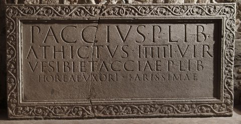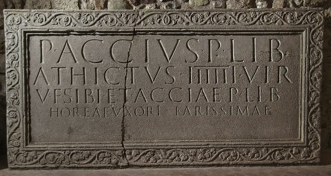 - P(ublius) Accius P(ubli) lib(ertus) / Athictus IIIIIIvir / v(ivus) fecit sibi et Acciae P(ubli) lib(ertae) / Horreae uxori karissimae
