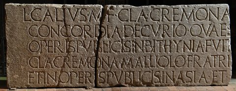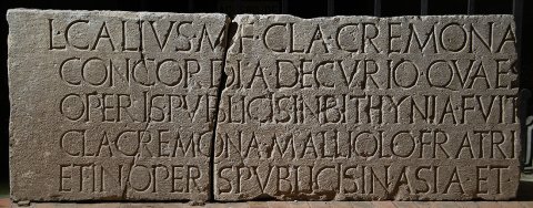 - L(ucius) Calius M(arci) f(ilius) Cla(udia) Cremona [---] / Concordia decurio quaes[tor ---] / operis publicis in Bithynia fuit [--- Calio M(arci) f(ilio)] / Cla(udia) Cremona Malliolo fratri [---] / et in operis publicis in Asia et [---]