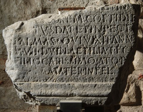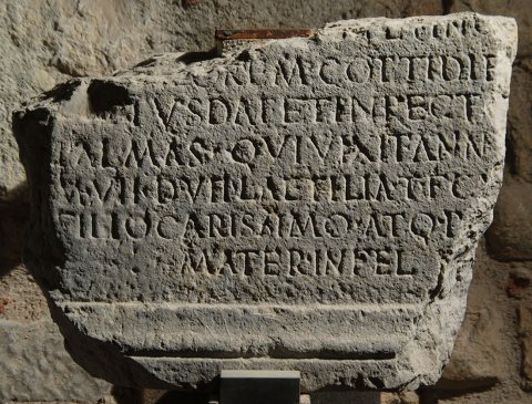 [-] Laet[i]lio C(ai) [f(ilio) G]a[ll]o / de[c(urioni)] dum c[u]pidus i[u]/venis urbem voluisse(m) / videre inde regrediens / incidi febribus acris at / pres[s]us graviter [a]misi / cu[m] flore i[u]vent[a]m / quoniam [in]iqua me [i]am / sic fata voca[ba]nt inton/samque tuli cru[deli fu]/nere barbam infelix / nec potui p[e]rfer[r]e vota / meorum [f]unere acer/bo iace[o] sedibus istis et / misera mater (h)abet in cor/de dolorem cottidie / fletus dat et in pectore / palmas qui vixit ann(os) XX / m(enses) VII d(ies) VII Laetilia T(iti) f(ilia) Custa / filio carissimo atq(ue) pient(issimo) / mater infel(icissima)