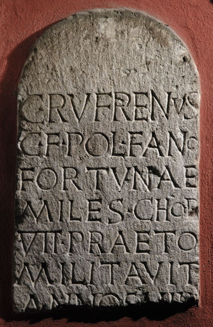 - C(aius) Rufrenus / C(ai) f(ilius) Pol(lia) Fano / Fortunae / miles c(o)hor(tis) / VII praeto(riae) / militavit / annos VIII