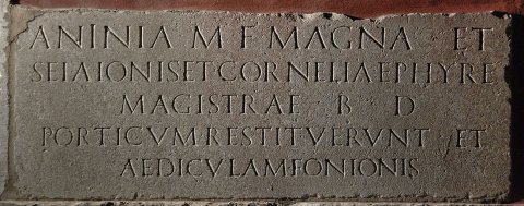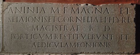 - Aninia M(arci) f(ilia) Magna et / Seia Ionis et Cornelia Ephyre / magistrae B(onae) D(eae) / porticum restituerunt et / aediculam Fonionis