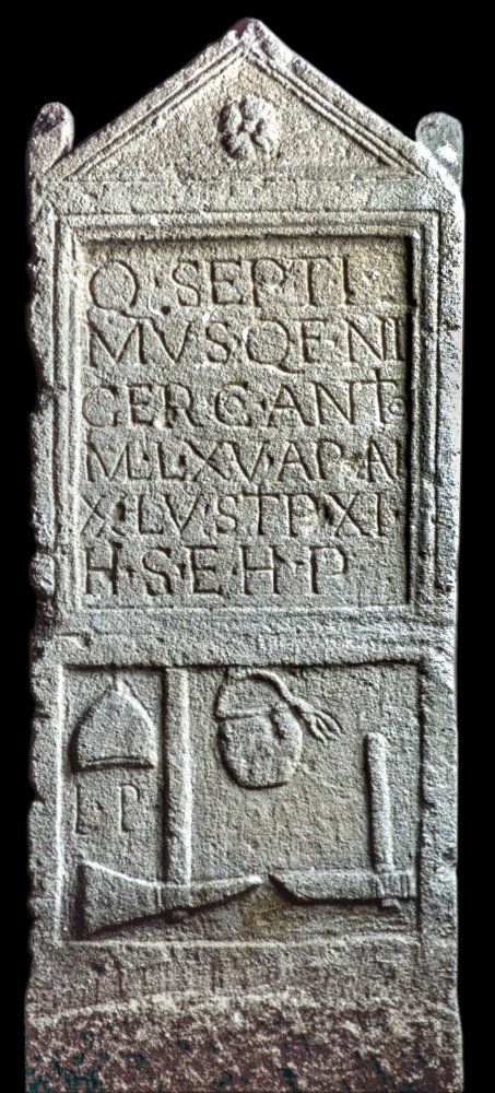 - Q(uintus) Septi/mius Q(uinti) f(ilius) Ni/ger Co(llina) Antio(chia) / mil(es) l(egionis) XV Ap(ollinaris) an(norum) / XXLV stip(endiorum) XI / h(ic) s(itus) e(st) h(eres) p(osuit)