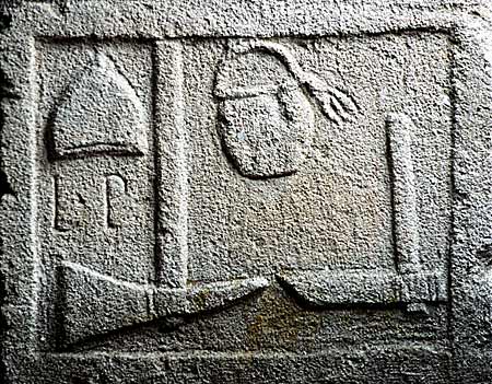 Im Sockelbild Werkzeug: Pileus, Axt, Schanzkorb, Spitzhacke. - Inschrift