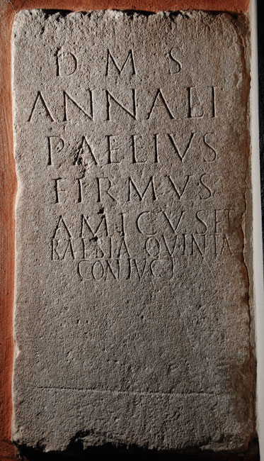 - D(is) M(anibus) s(acrum) / Annali / P(ublius) Aelius / Firmus / amicus et / Baebia Quinta / coniugi