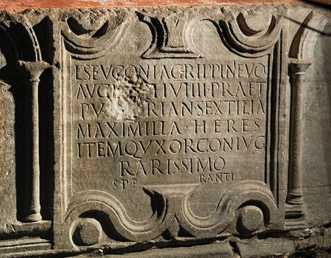 - L(uci) Seugoni Agrippini evok(ati) / Aug(usti) n(ostri) [c]oh(ortis) VIIII praet(oriae) / P(iae) V(indicis) S[ev]erian(ae) Sextilia / Maximilla heres / itemq(ue) uxor coniug(i) / rarissimo / speranti